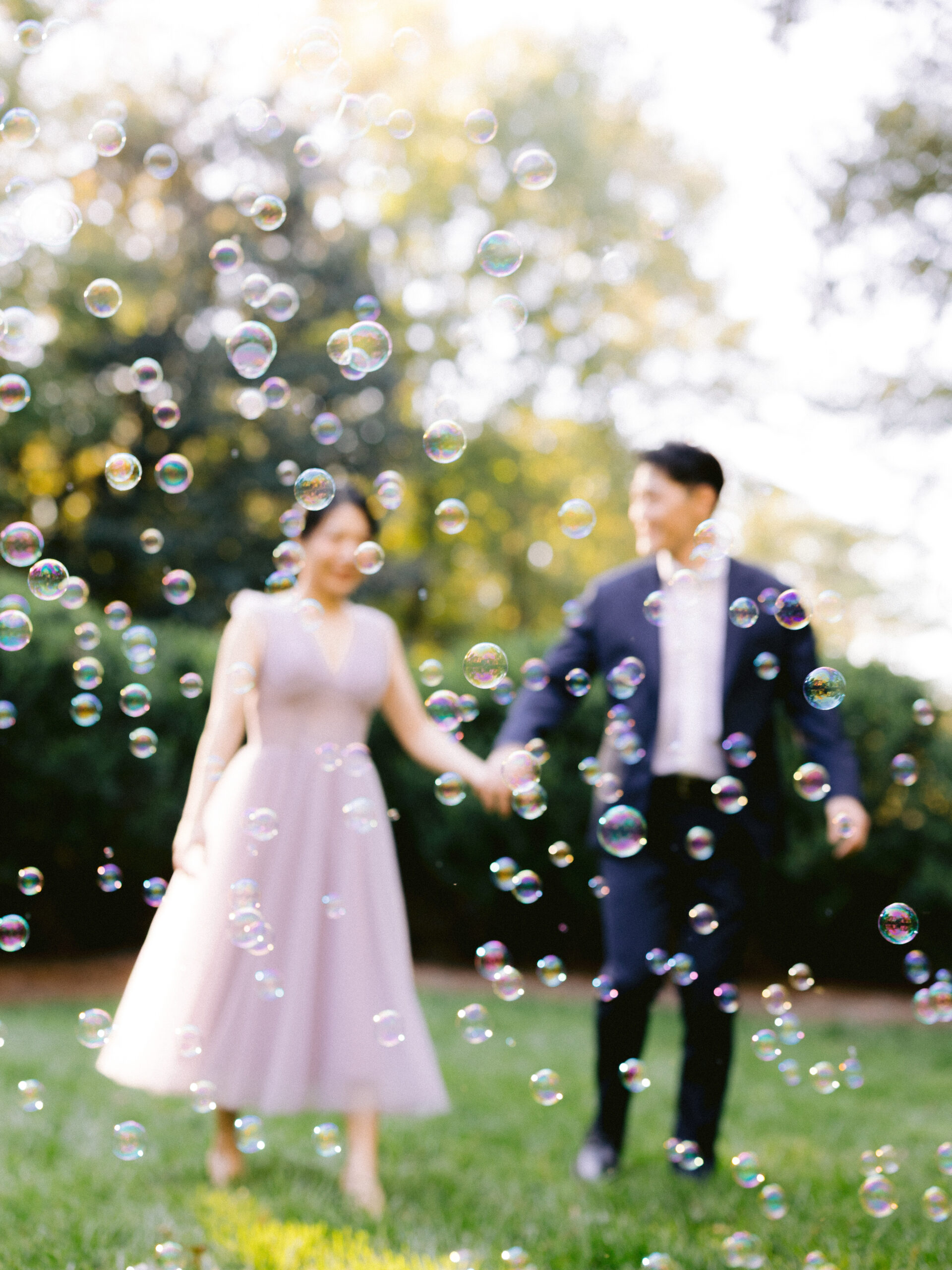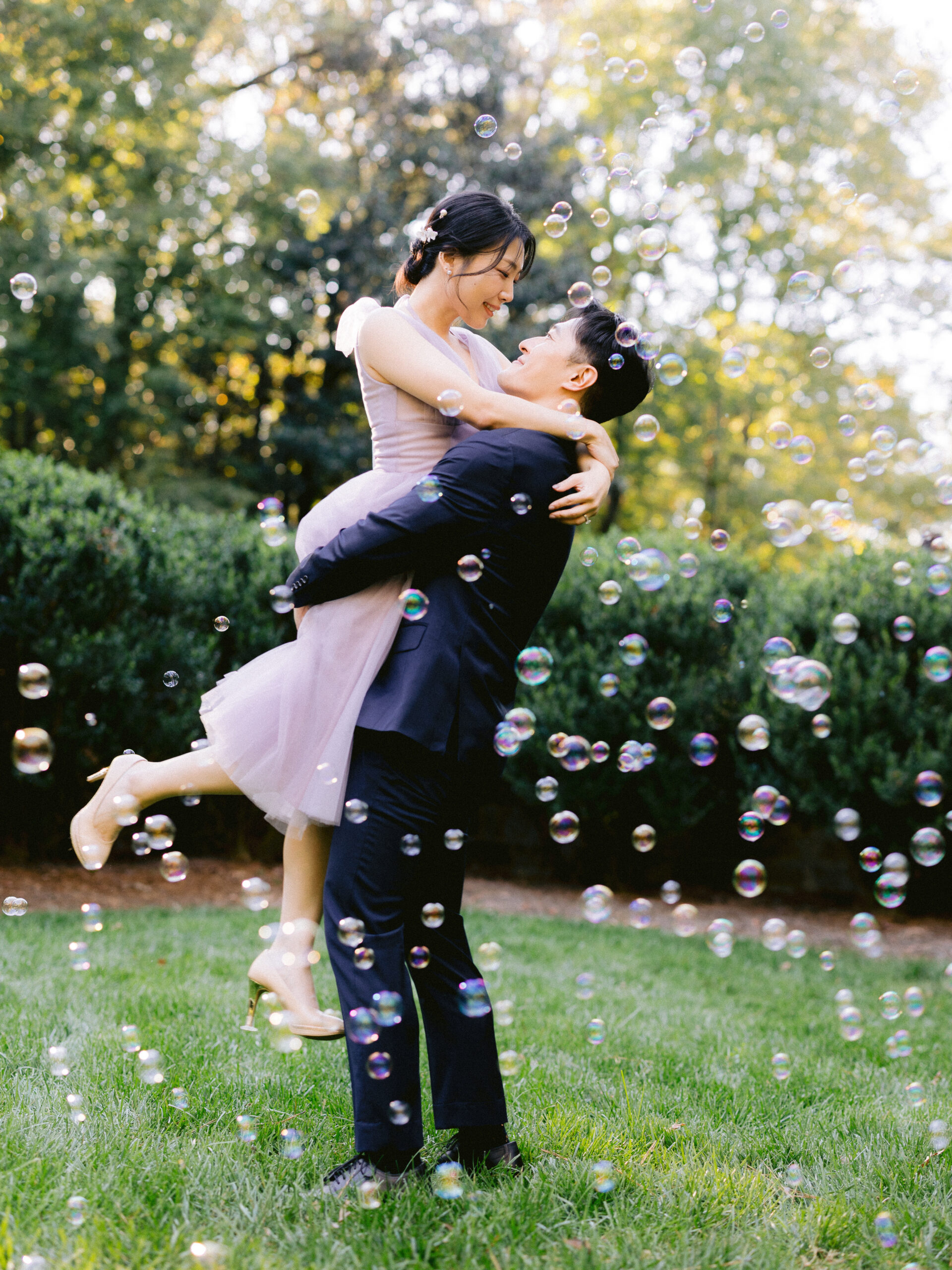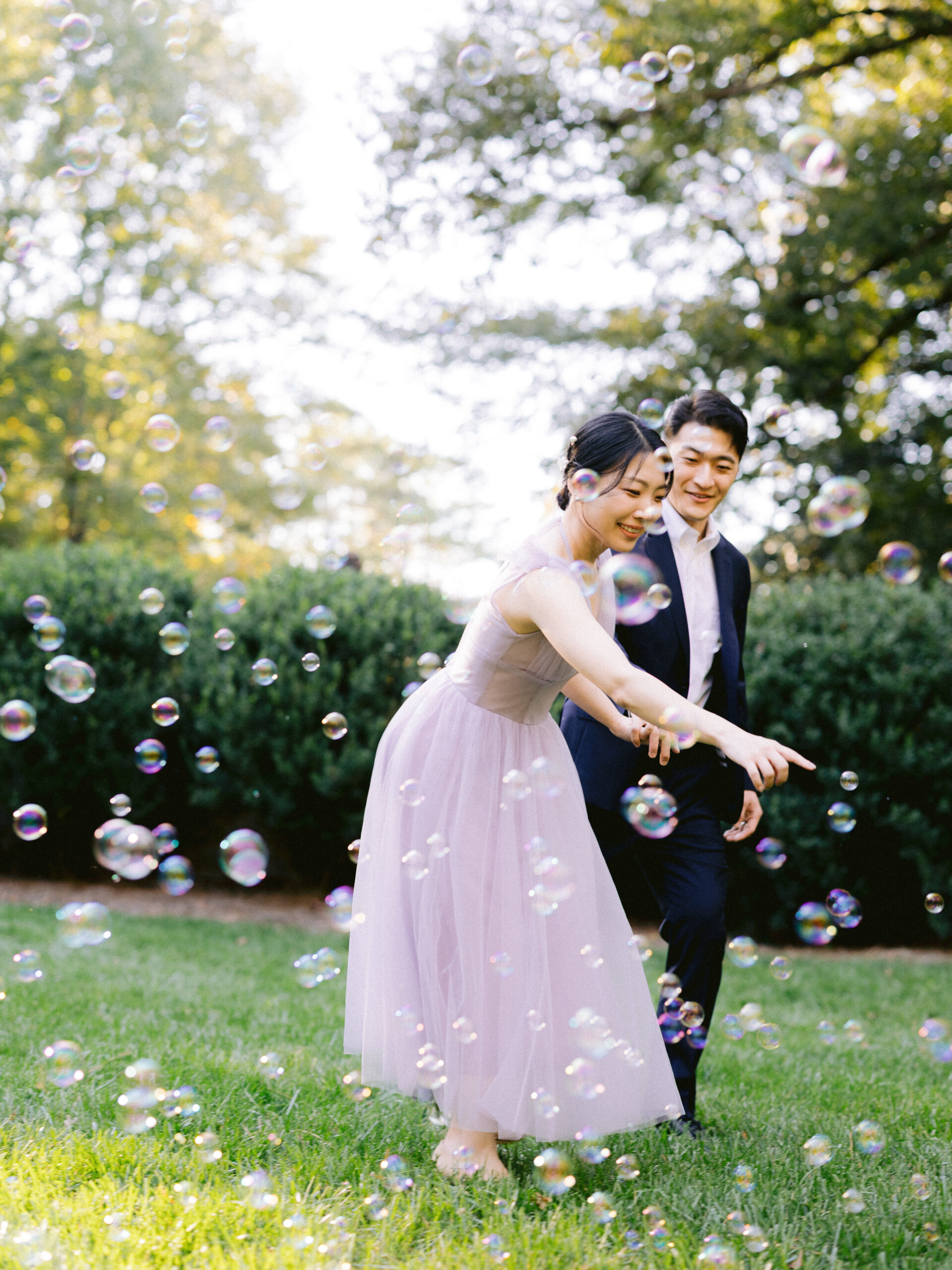 Because Sally loves bubbles, I surprised the couple by bringing a bubble machine from my home. This fun addition instantly brought the session to life. As bubbles drifted through the garden, Sally and Harrison laughed and played, adding a joyful and lighthearted energy to their Swan House engagement portraits. The moment perfectly reflected their personalities — romantic, fun, and full of laughter.