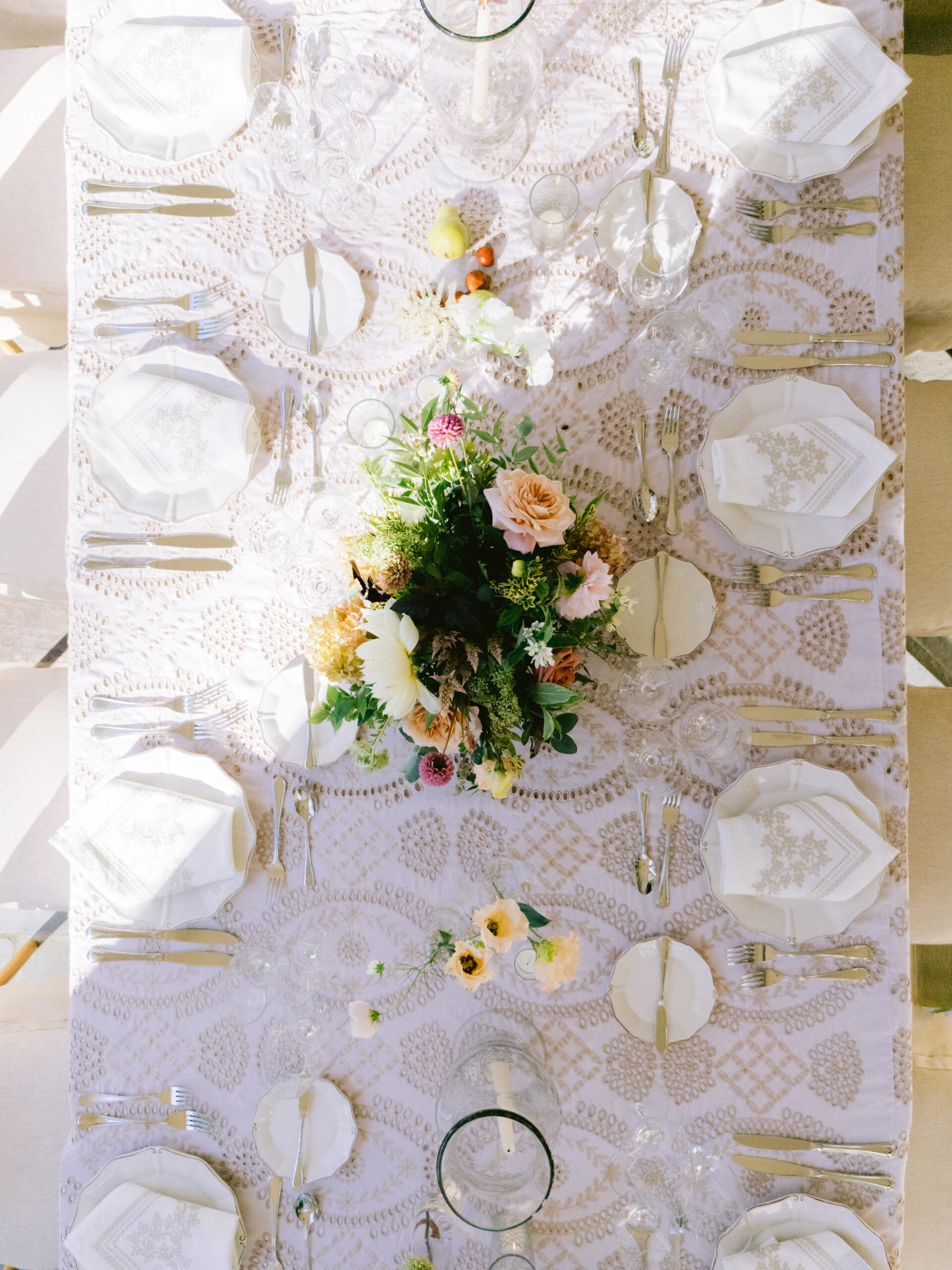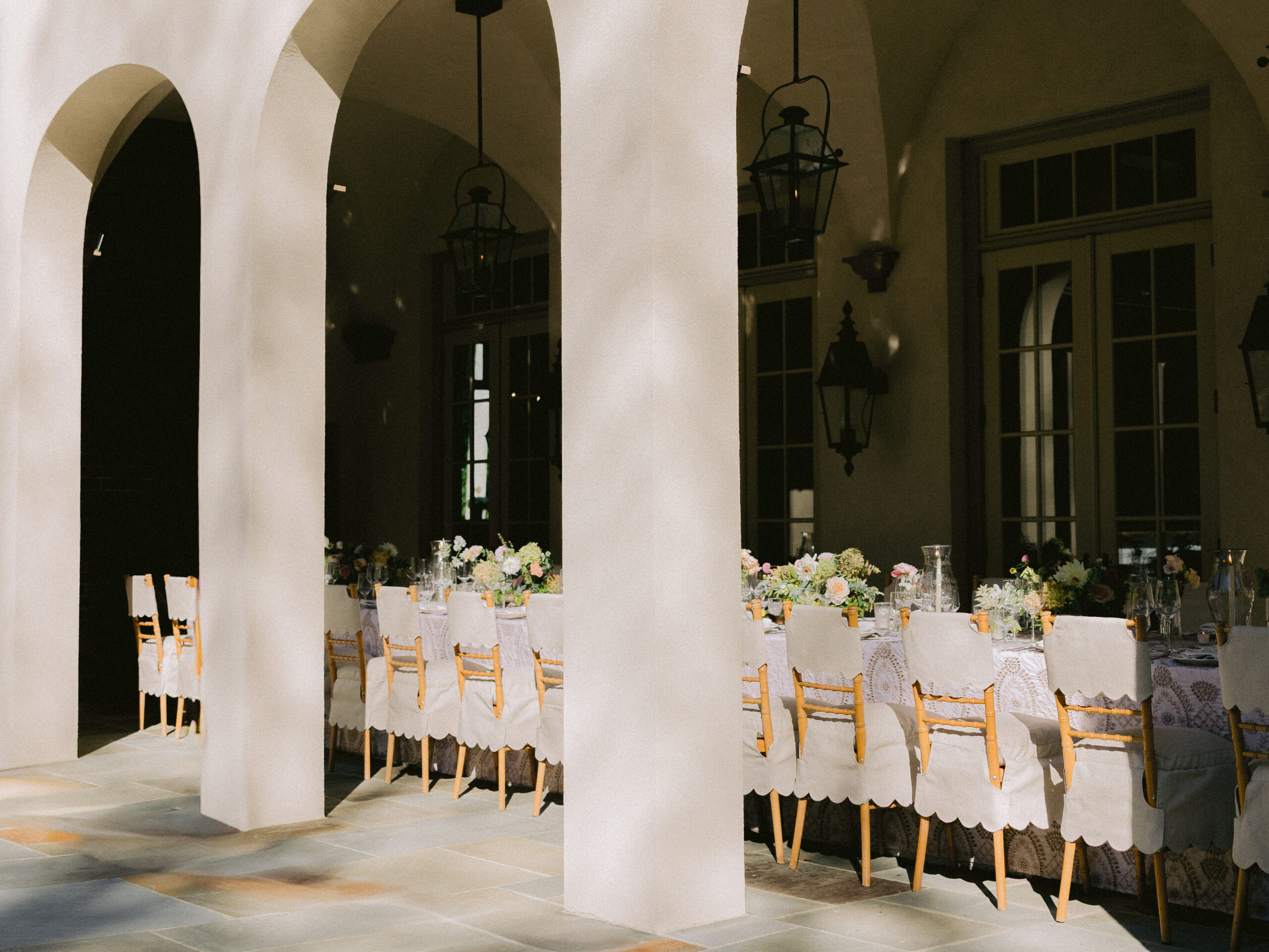 The reception continued the intimate feeling of the day. Long tables were styled with neutral linens and delicate florals. Place settings remained simple and elegant.
