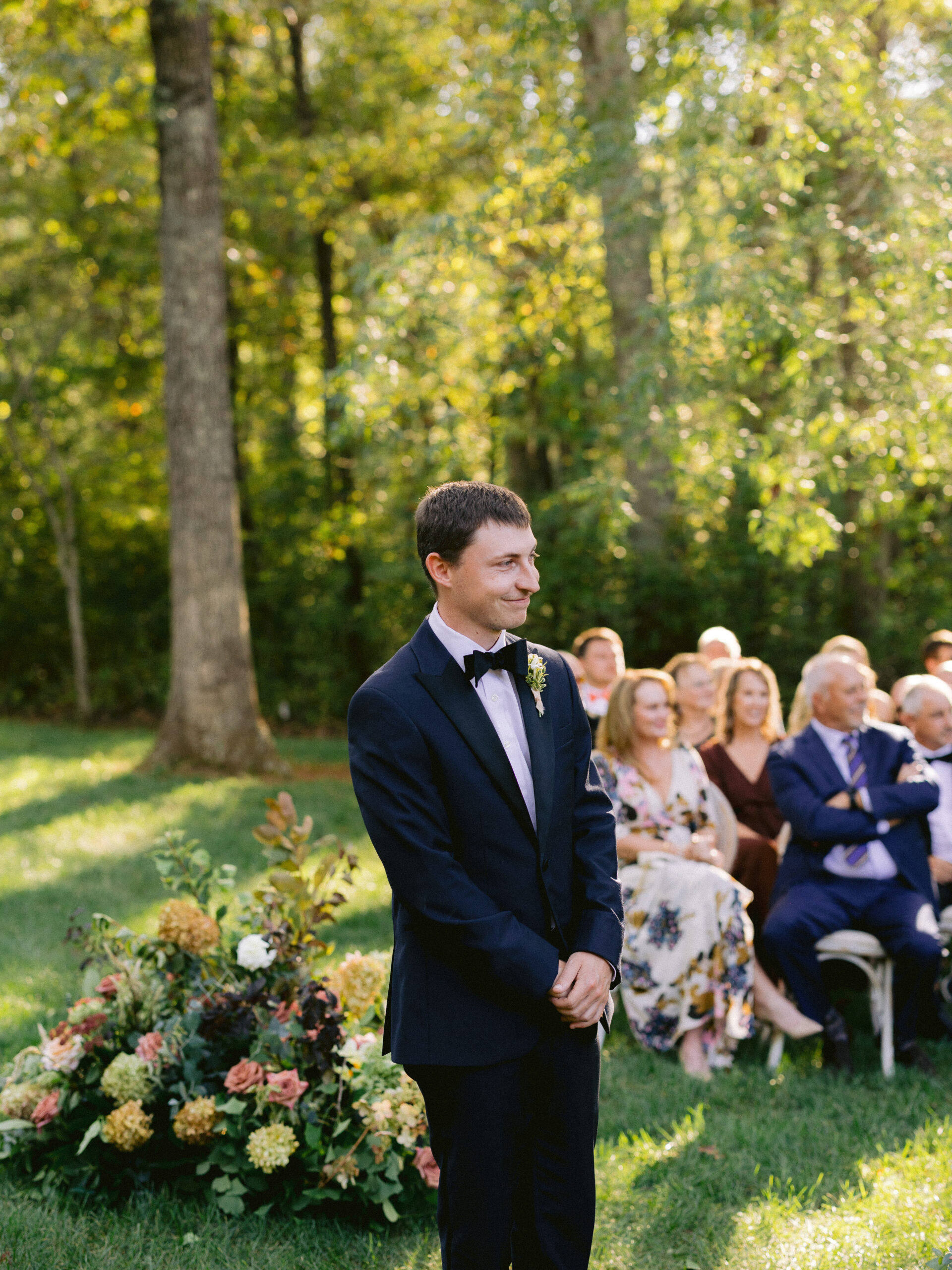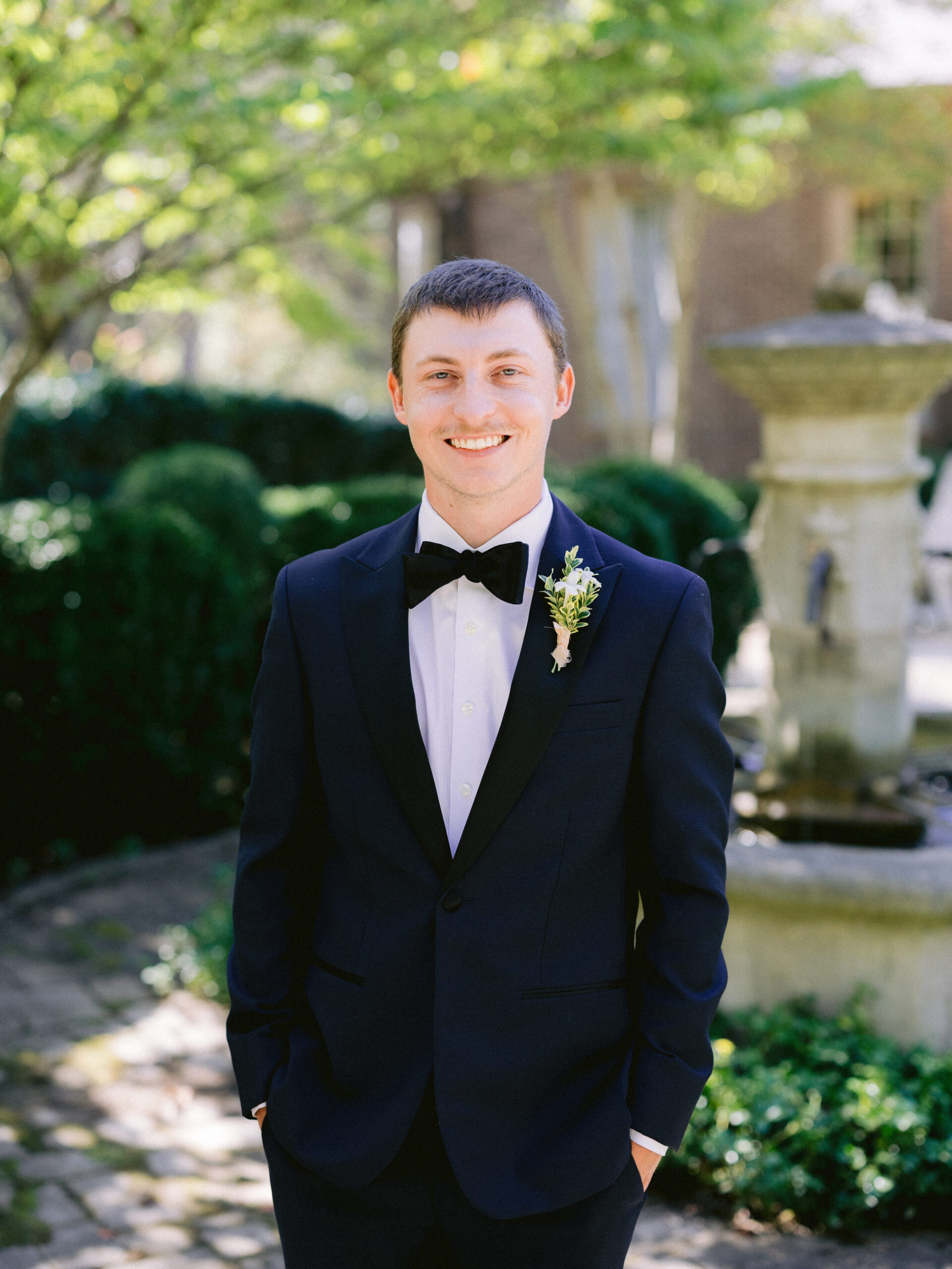 Meanwhile, Adam wore a classic tuxedo with a black bow tie. His look felt refined, yet relaxed. Together, their outfits complemented the estate’s understated charm.